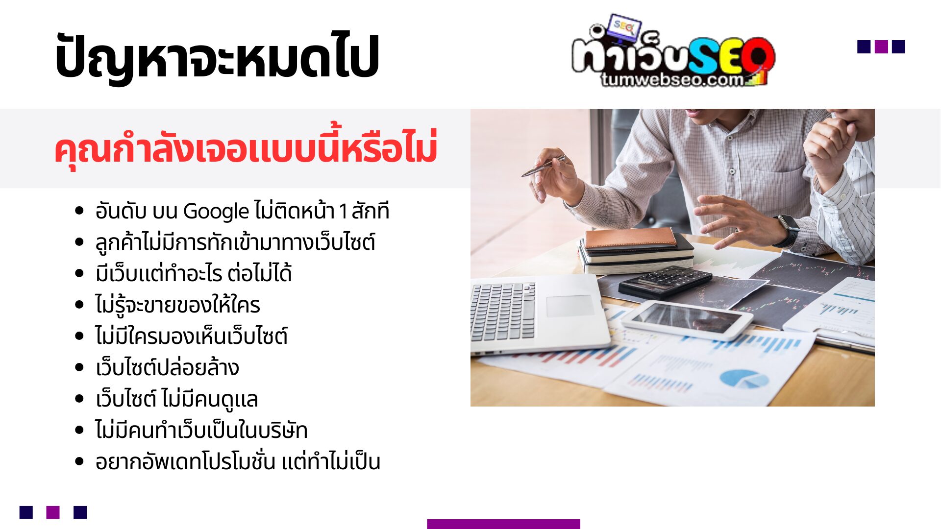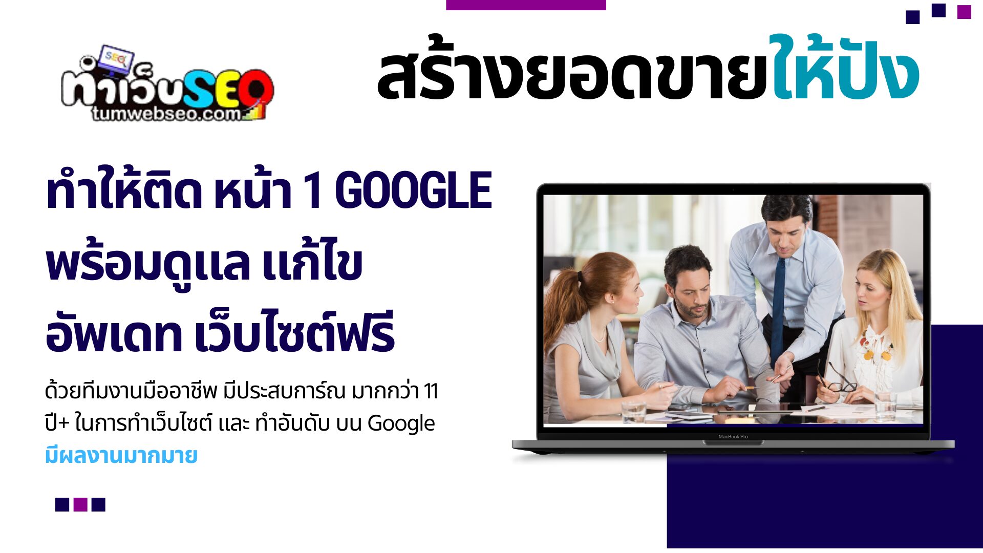 ทีมงาน TumWebSEO มีประสบการ์ณทำเว็บไซต์ และ อันดับบน Google มามากกว่า 11 ปี ด้วยกัน และ เรายังคิดราคา ที่ไม่ต้องจ่ายแพง หรือ คุ้มกว่าไป จ้างพนักงาน มานั่งในออฟฟิส โดยที่ จ้างเราทำอันดับ Google ให้ติดในหน้าแรก เรายังช่วย ดูแล แก้ไข อัพเดท ข้อมูลในเว็บไซต์ของท่านให้ด้วย